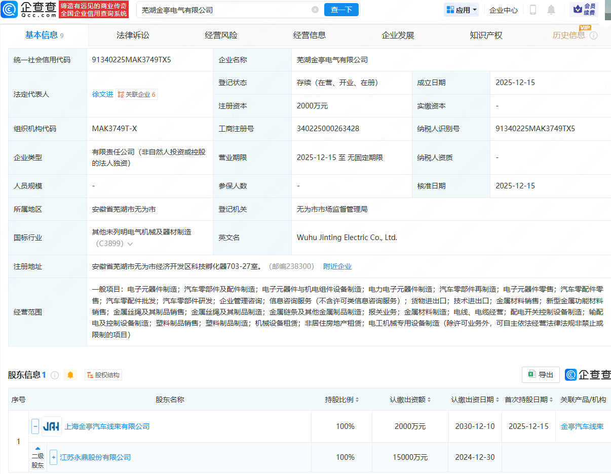 近日安信策略,芜湖金亭电气有限公司成立,法定代表人为徐文进,注册资本为2000万元,经营范围包含:电子元器件制造;汽车零部件及配件制造;电子元器件与机电组件设备制造;电力电子元器件制造等。企查查股权穿透显示,该公司由永鼎股份(600105)间接全资持股。